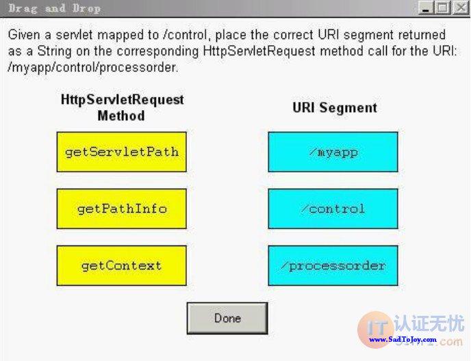 Given a servlet mapped to /control, place the correct URI segment returned as a String on the corresponding HttpServletRequest method call for the URI: /myapp/control/processorder.